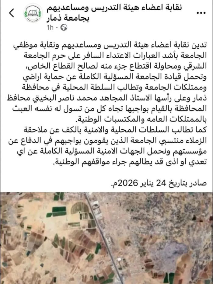 كما طالبت النقابة الجهات الأمنية بملاحقة المتورطين في هذه المحاولة ومحاسبتهم قانونيا، محذرة من تبعات استغلال المواقع الوطنية لتحقيق مصالح شخصية على حساب المصلحة العامة، مرفقة بيانها بصورة جوية للمنطقة محل النزاع، في إشارة إلى أهمية الحفاظ على ممتلكات الجامعة من أي محاولات استغلال أو تفريط.