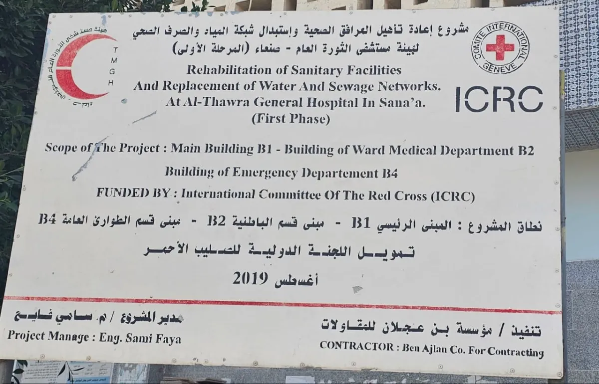 وأرفق منشوره بصورة توثق لوحة مشروع إنشائي أمام مستشفى الثورة العام في صنعاء، تحمل نصوصا بالعربية والإنجليزية، وتوضح تفاصيل مشروع خدمي طبي بتمويل من اللجنة الدولية للصليب الأحمر (ICRC) يهدف إلى تحسين البنية التحتية الصحية في المستشفى الأكبر بالعاصمة، عبر تحديث شبكات المياه والصرف الصحي، بما يعزز خدمات الطوارئ والباطنية ويضمن بيئة صحية أفضل للمرضى والعاملين، ويحمل عنوان (إعادة تأهيل المرافق الصحية واستبدال شبكة المياه والصرف الصحي – المرحلة الأولى)، معلقا بالقول إن "كل ما تم عمله في هذا انتهى".