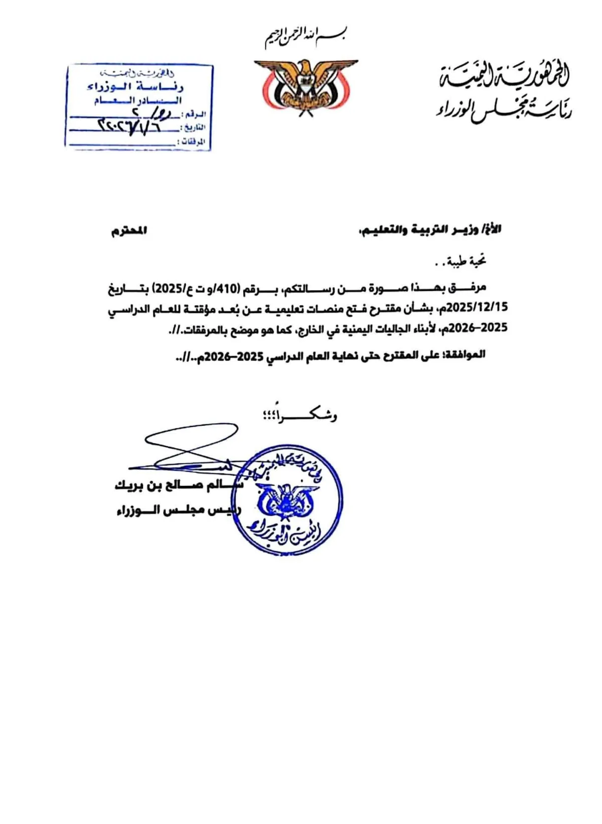 وأوضحت عقيل في منشور على فيسبوك رصدته "النقار" أن القرار الوزاري الأخير يتناقض بشكل صارخ مع مذكرة رسمية صادرة عن رئيس مجلس الوزراء سالم صالح بن بريك بتاريخ 6 يناير 2026، والتي تضمنت موافقة واضحة على مقترح فتح منصات تعليمية مؤقتة عبر الإنترنت للعام الدراسي 2025-2026م، مخصصة لأبناء البعثات اليمنية في الخارج.