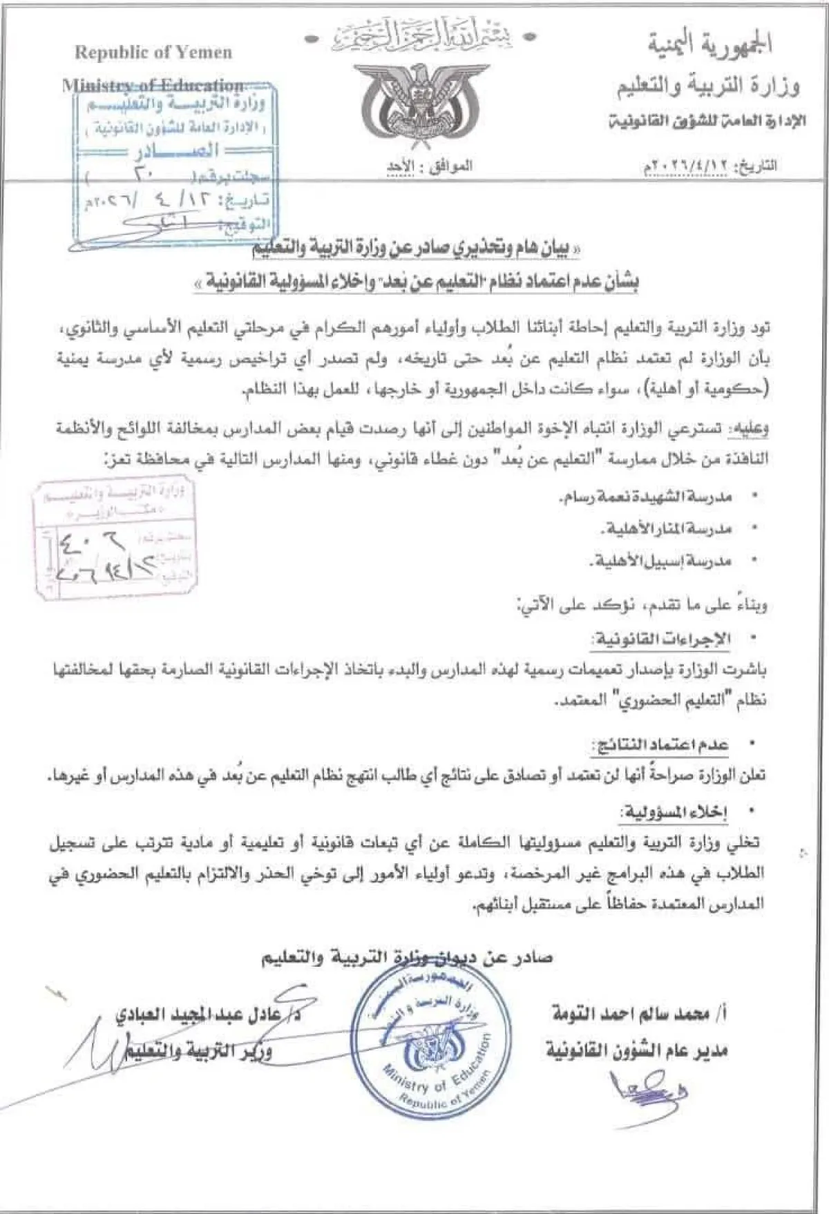 وبحسب القرار الصادر بتاريخ 12 أبريل، فإن وزارة التربية ترفض بشكل قاطع اعتماد التعليم عن بُعد، وتحذر من التعامل مع المدارس التي تروج لهذا النظام مع إخلاء مسؤوليتها القانونية.